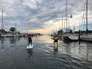 Lessons are given to everyone so that you can paddle comfortably around the harbor. May include workouts on your board if so inclined. Trudie loves to do her downward dog, chair pose and planks – but please do not feel intimated. Chris is up for his SUPilates – pilates on the sup board or sit ups for most of us.